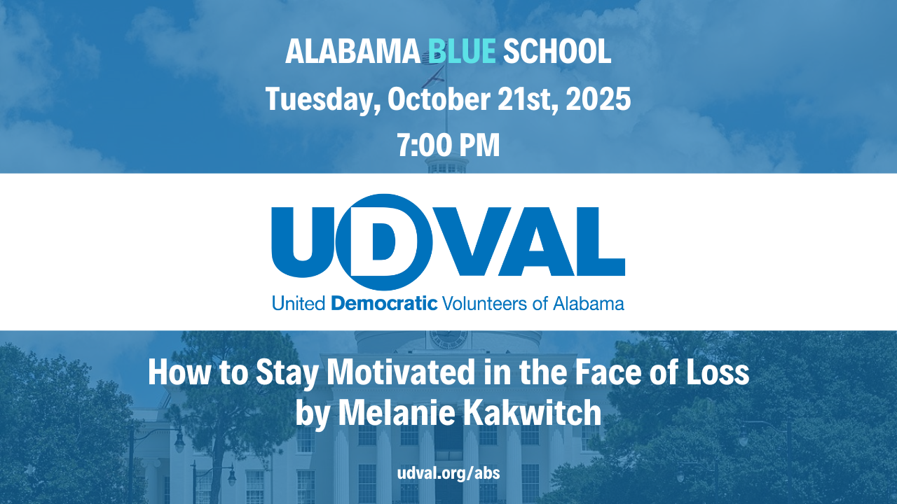 Alabama Blue School is a monthly virtual discussion with Democrats from across the state where we learn a new topic and share what we know. We generally meet over Zoom on the third Tuesday of every month. More information below.